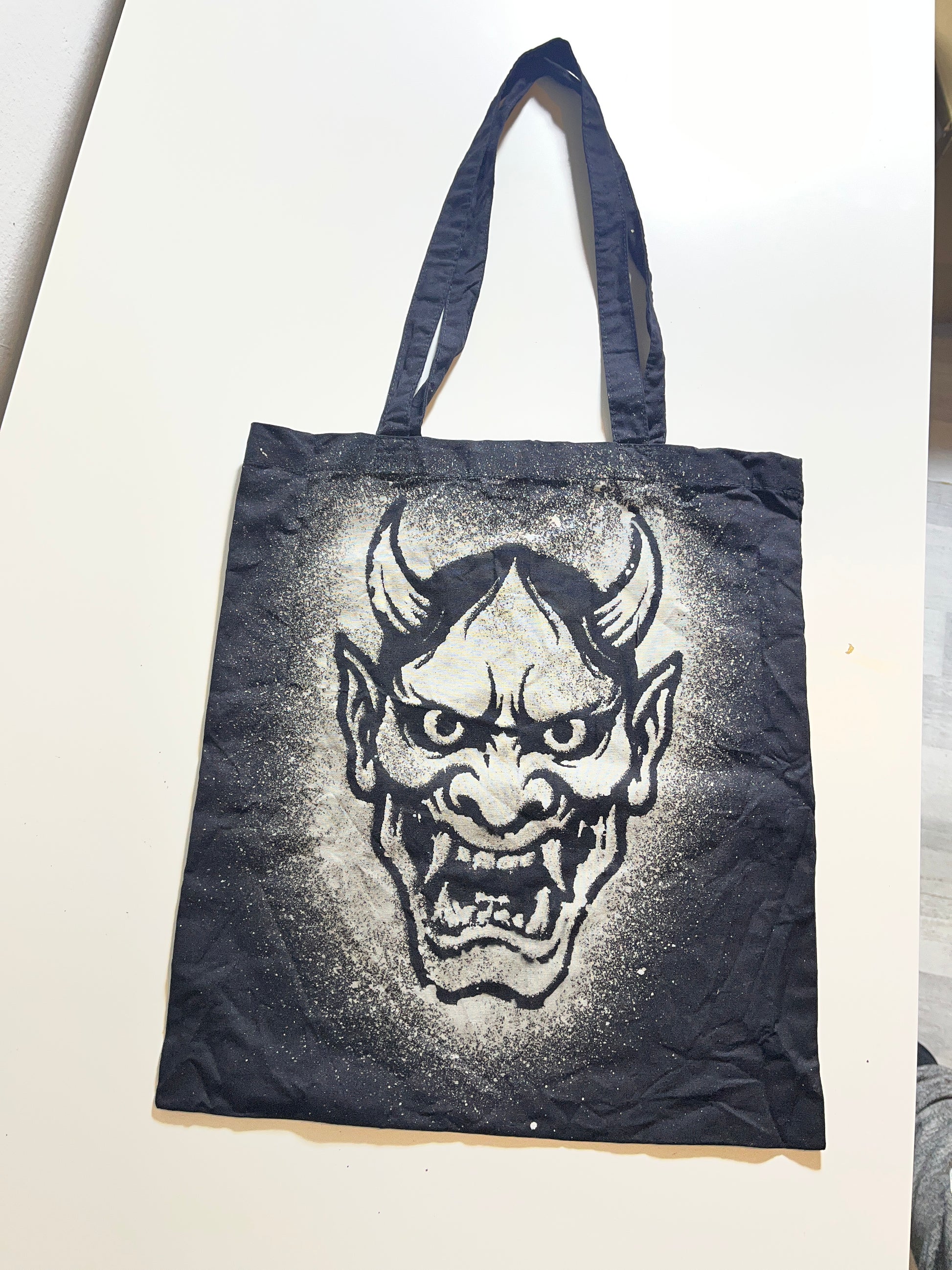 Tűnj ki a tömegből ezzel az egyedi, kézzel készített Oni maszkos vászontáskával. Látványos, szórt festéstechnikával készült japán démonmaszk minta található mindkét oldalán.